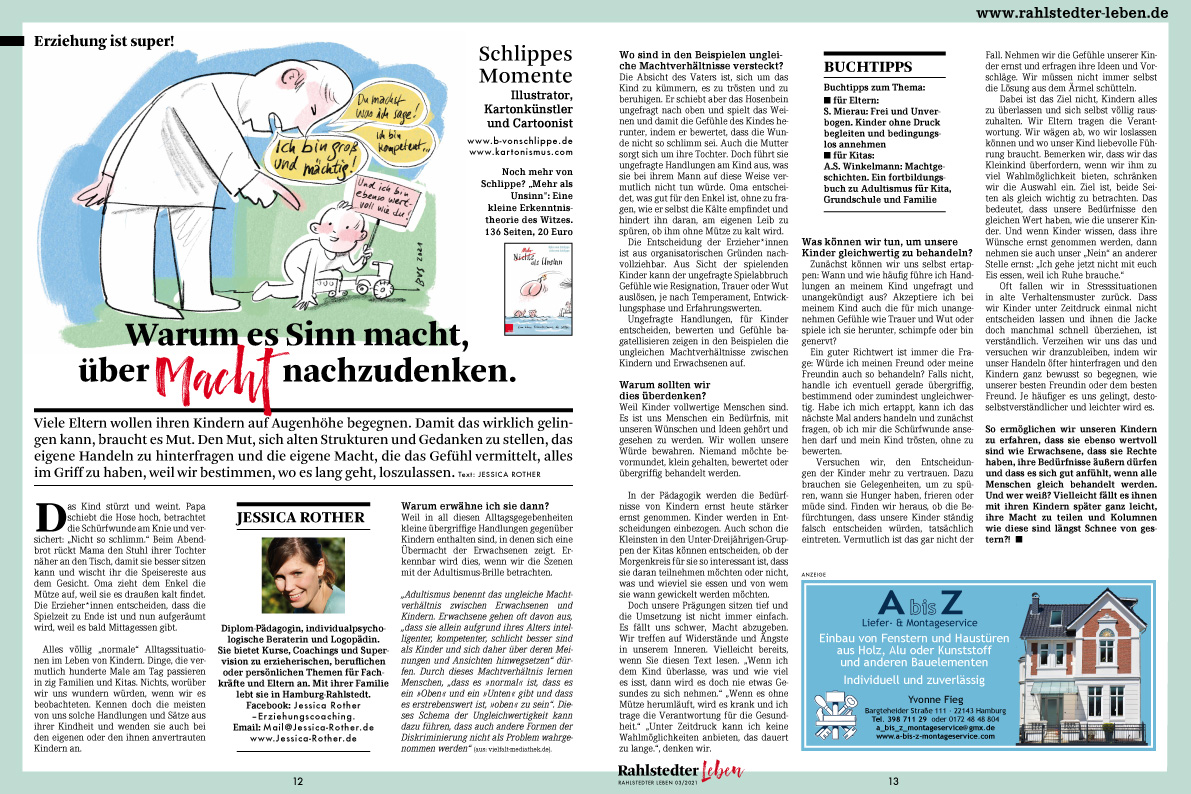 Viele Eltern wollen ihren Kindern auf Augenhöhe begeben. Damit das wirklich gelingen kann, braucht es Mut. Den Mut, sich alten Strukturen und Gedanken zu stellen, das eigene Handeln zu hinterfragen und die eigene Macht, die das Gefühl vermittelt, alles im Griff zu haben, weil wir bestimmen, wo es lang geht, loszulassen. (Text: Jessica Rother)