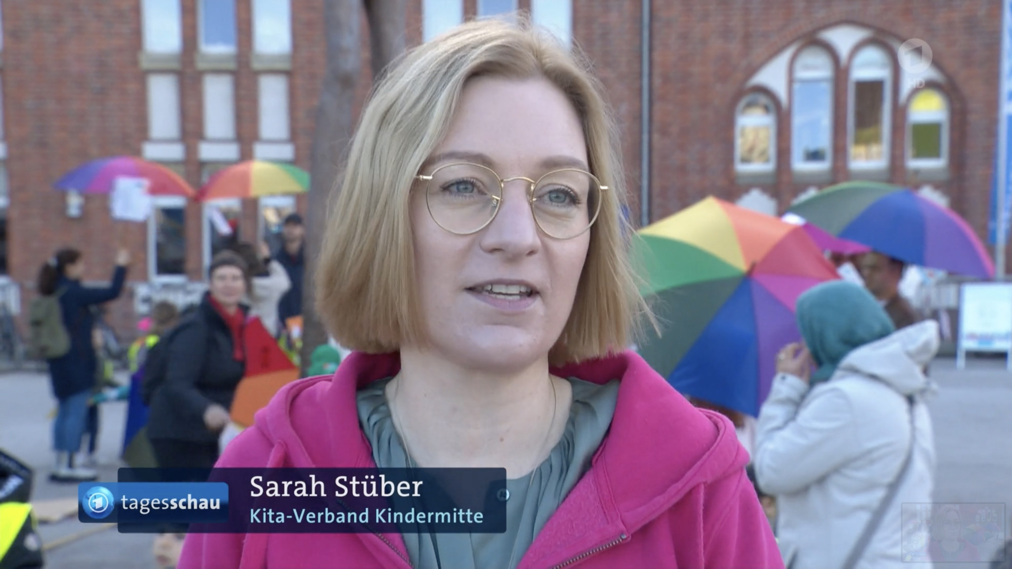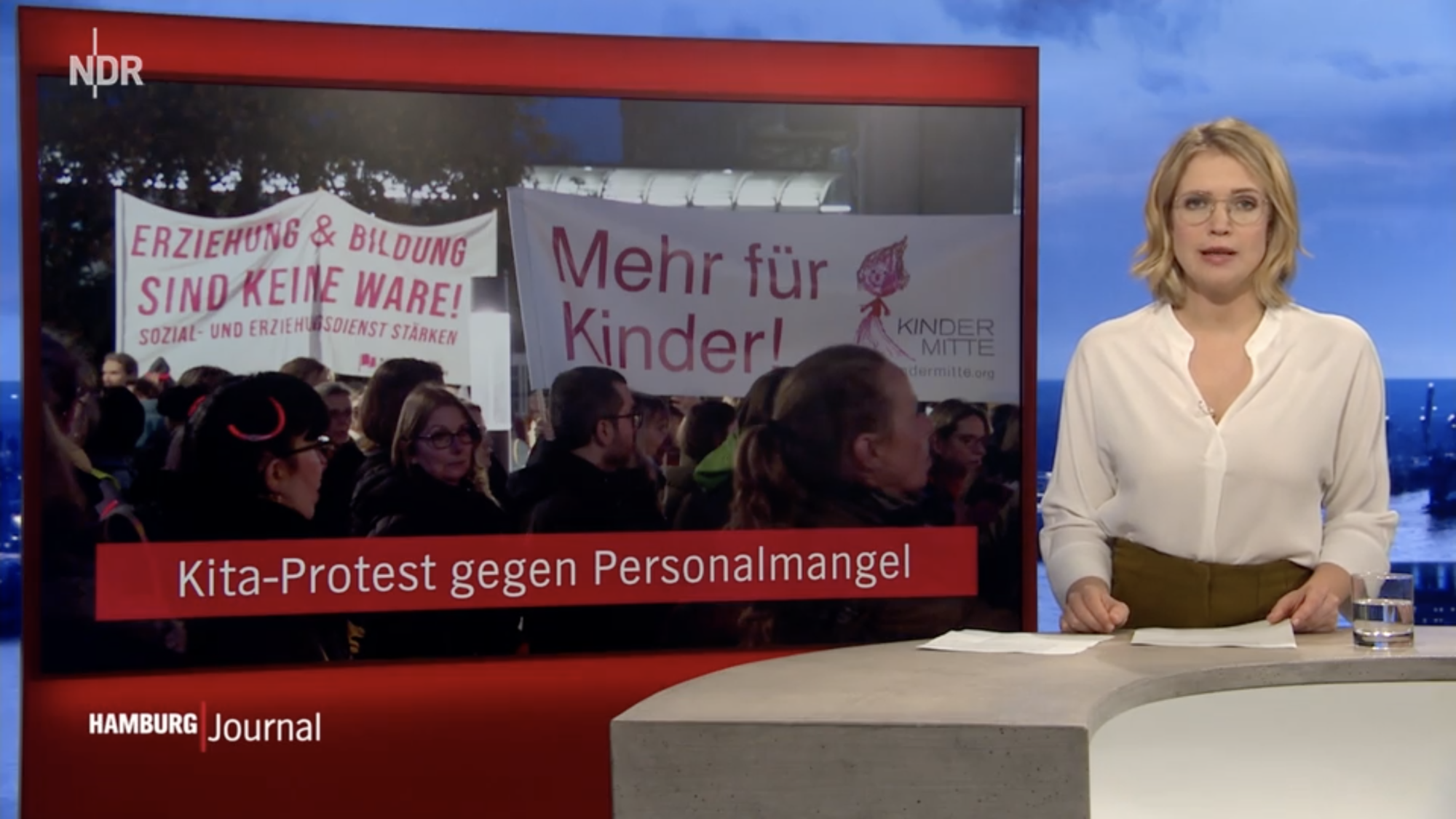Liane von der Kita-Luisito II spricht im Bericht von Hamburg-Journal und Tagesschau vom 19.10. über Ihre Arbeit als Sprach-Fachkraft im Rahmen des Bundesprogramms Sprach-Kita und darüber, was durch eine Streichung des Programms für die Kinder verloren ginge.