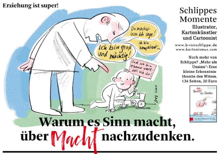 Viele Eltern wollen ihren Kindern auf Augenhöhe begeben. Damit das wirklich gelingen kann, braucht es Mut. Den Mut, sich alten Strukturen und Gedanken zu stellen, das eigene Handeln zu hinterfragen und die eigene Macht, die das Gefühl vermittelt, alles im Griff zu haben, weil wir bestimmen, wo es lang geht, loszulassen. (Text: Jessica Rother)